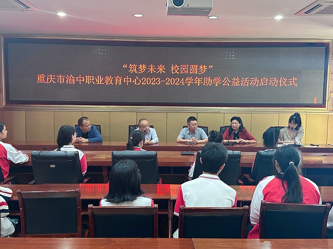 近日,重庆市渝中职业教育中心举办了2023-2024学年“筑梦未来 校园圆梦”助学公益活动启动仪式,仪式由学校团委书记徐婷主持。重庆笑园食品配送有限公司领导邓小庆、渝中职业教育中心党委副书记朱喜祥、副校长彭茜、学生处副主任李恒以及部分受资助学生代表参加了此次启动仪式。