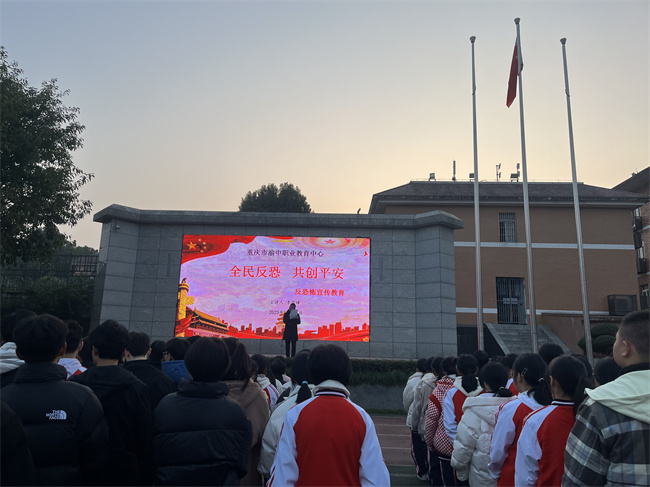 12月25日,按照《渝中职教中心2023年反恐怖宣传教育活动方案》,在全校升旗仪式上,学校安稳办主任李雪峰作了《全民反恐 共创平安》的主题讲话,强调防范恐怖袭击的注意事项、防范措施,并组织观看了由重庆市反恐怖工作领导小组办公室发布的《公民防范恐怖袭击宣传之校园篇》宣传视频。12月26—28日,各班级开展了反恐防暴主题教育活动。