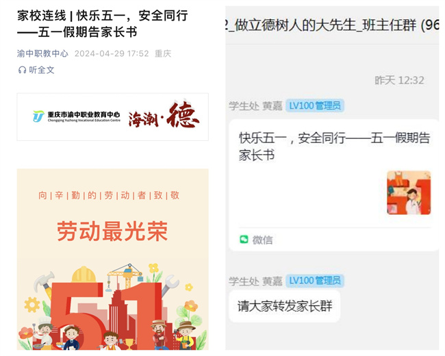 加强家校联系。学校通过微信公众号发布五一假期安全注意事项、为学生和家长印发和签订《五一节假期告家长书》.各班级转发安全提醒至家长群,加强学校与家长的沟通和联系,增强家长的安全意识和监护人责任意识,共同做好学生安全工作,确保假期无安全隐患。