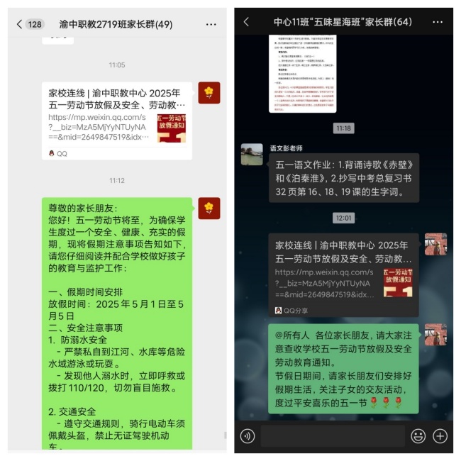 学校通过微信多渠道强化假期安全管理,通过微信公众号发布五一假期安全注意事项,向学生和家长印发并签订《五一节假期告家长书》,各班级转发安全提醒至家长群,加强学校与家长的沟通和联系,增强家长的安全意识和监护人责任意识,共同做好学生安全工作,确保假期无安全隐患。