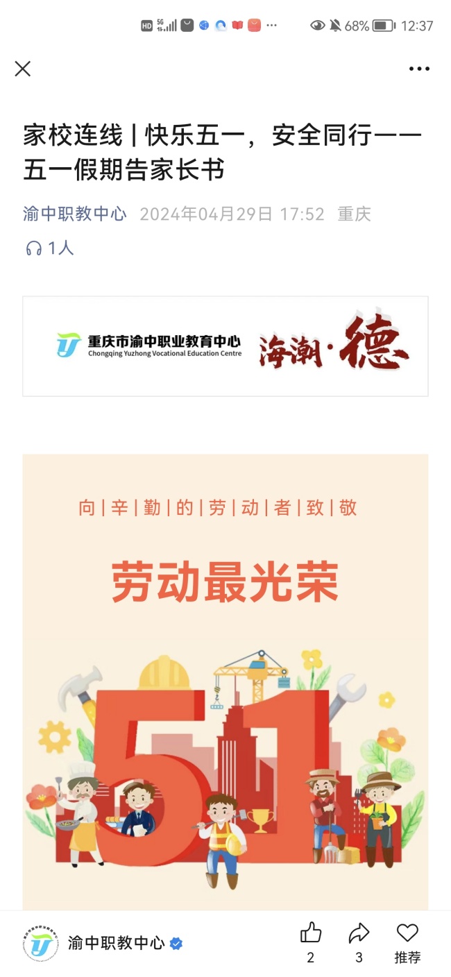 “五一”劳动节小长假将至,为有效预防校园安全事故,确保校园安全稳定,根据上级文件精神,重庆市渝中职业教育中心积极开展五一劳动节放假前安全教育及安全隐患排查活动。