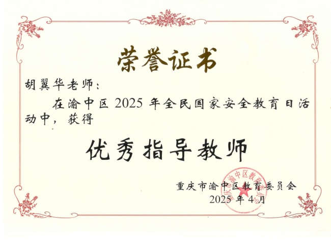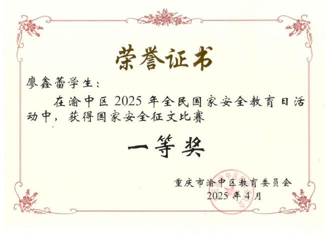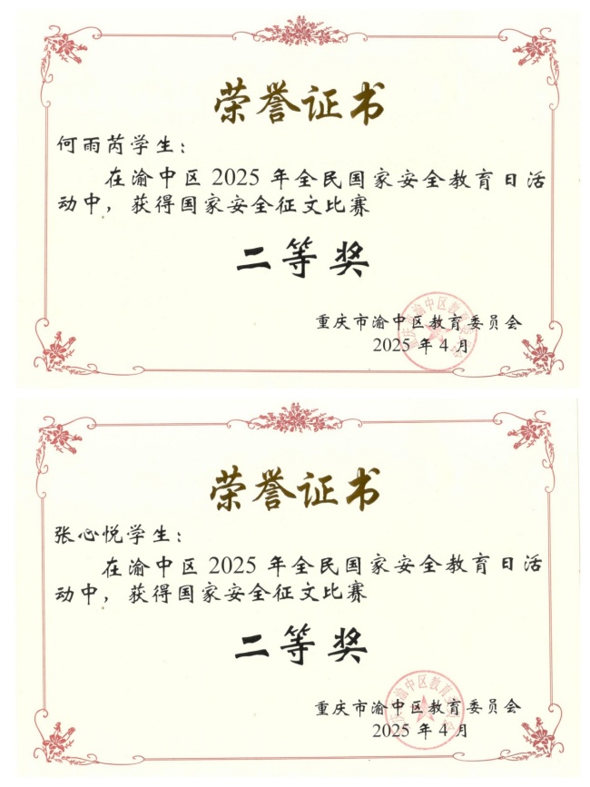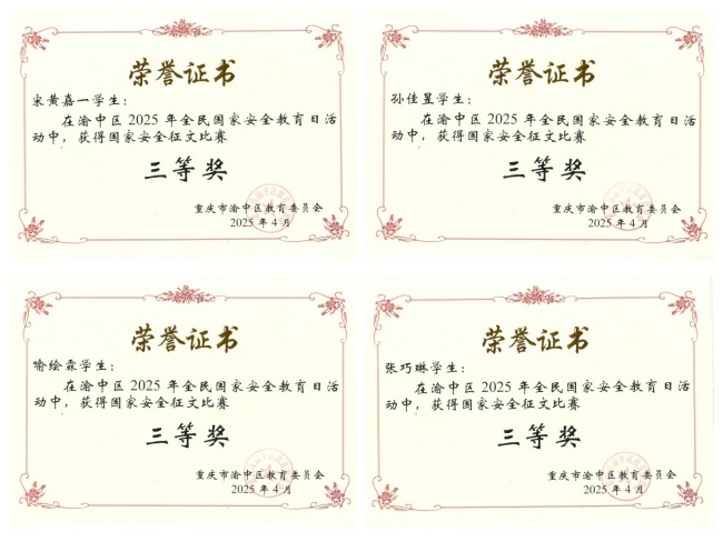 在渝中区2025年全民国家安全教育日活动中,重庆市渝中职业教育中心学生廖鑫蕾荣获国家安全征文比赛一等奖;学生何雨芮、张心悦均荣获国家安全征文比赛二等奖;学生孙佳昱、喻绘霖、宋黄嘉一、张巧琳分别荣获国家安全征文比赛三等奖。教师胡翼华、申翔玫、李秋燕分别荣获“优秀指导老师”奖。