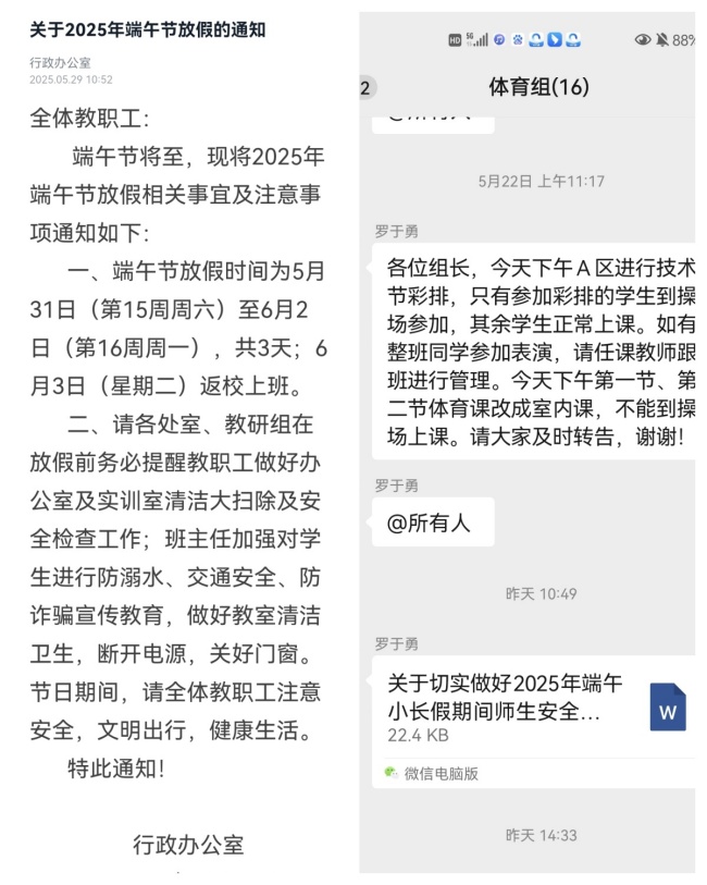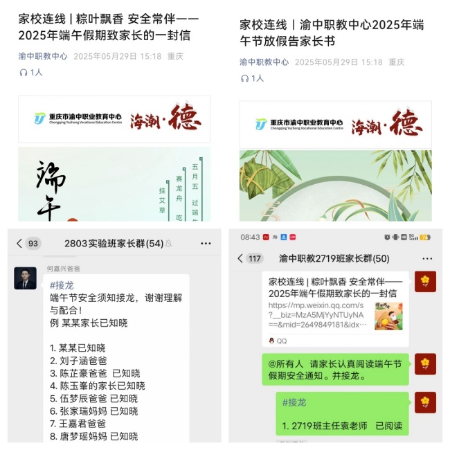 加强家校联系。为加强学校与家长的沟通和联系,学校通过微信公众号发布了《家校连线—渝中职教中心2025年端午节放假告家长书》、各班级为每位学生及家长发放《重庆市渝中职业教育中心2025年端午节放假告家长书》、各班主任转发由重庆渝中教育微信公众号发布的《粽叶飘香,安全常伴——2025年端午假期致家长的一封信》至班级家长群,并要求每位家长接龙回复知晓内容,增强家长的安全意识和监护人责任意识,共同做好学生的安全工作。
