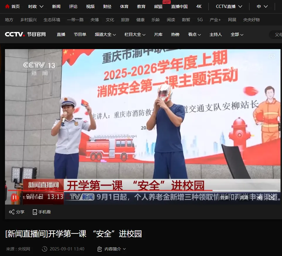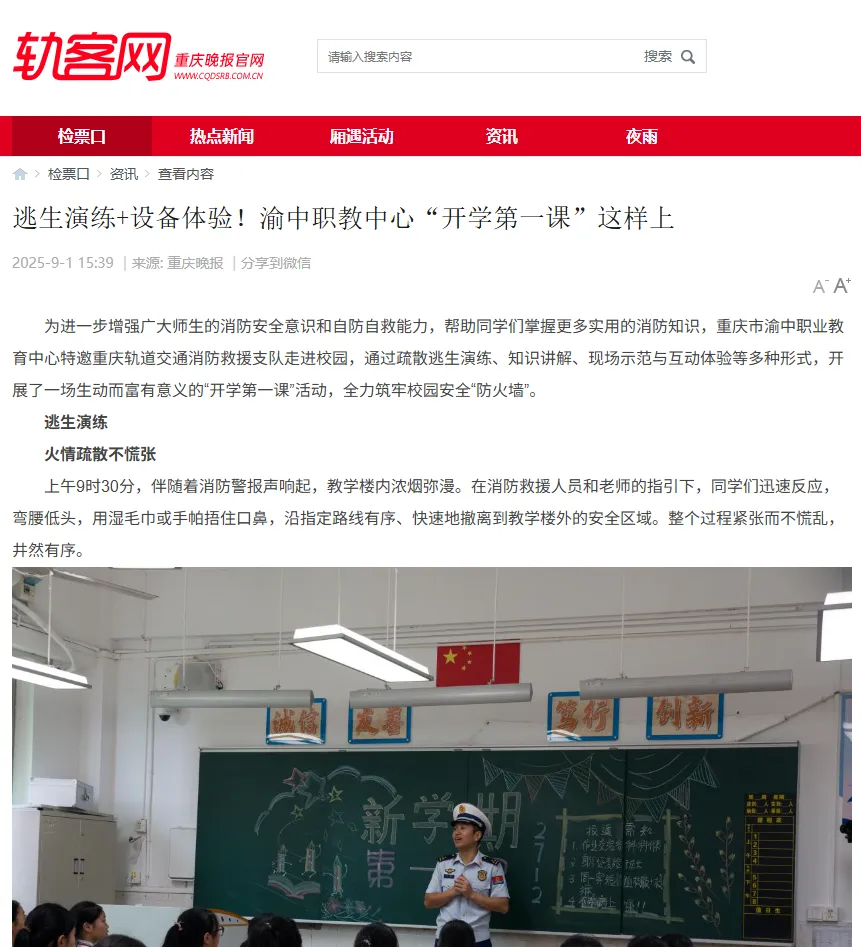 9月1日,中央电视台《新闻直播间》、重庆晚报官网—轨客网分别对渝中职教中心组织开展的“消防安全第一课”主题活动进行了特别报道。