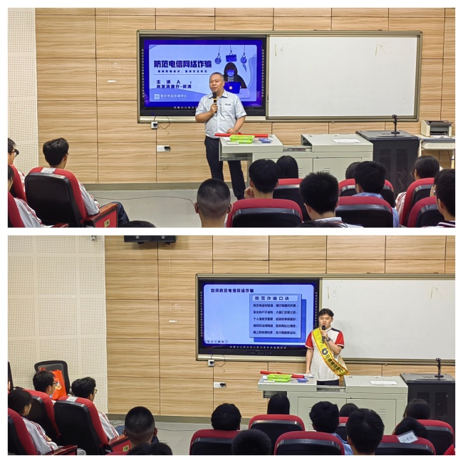 9月18日,各班级开展了网络安全主题班会活动。9月19日,渝中区肖家湾建行主任何涛主动到校为学生开展了主题为《防范电信网络诈骗》知识讲座,他运用生动详实的案例,向全校安全委员们宣传了金融领域防范网络诈骗等知识,引导学生提高警惕,保护好个人财产安全。讲座尾声,安全委员代表带领全体同学共同齐声朗读了“防范诈骗口诀”。