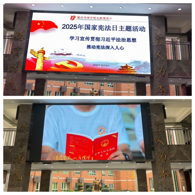 活动前,学校制定了《渝中职教中心2025年“宪法宣传周”活动方案》。12月1—5日,学校教学楼、实作楼电子显示屏滚动播放宪法宣传PPT和视频。
