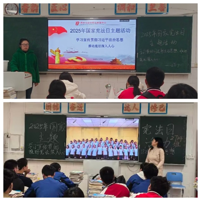 12月4日,各班级组织学生开展宪法日主题歌曲传唱活动。班主任们带领学生传唱由重庆市教委提供的主题视频,并传唱主题曲《宪法伴我们成长》。