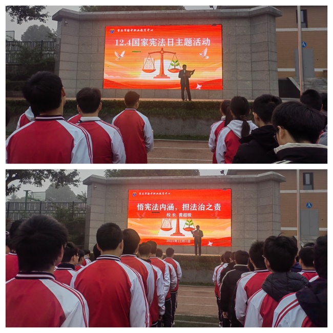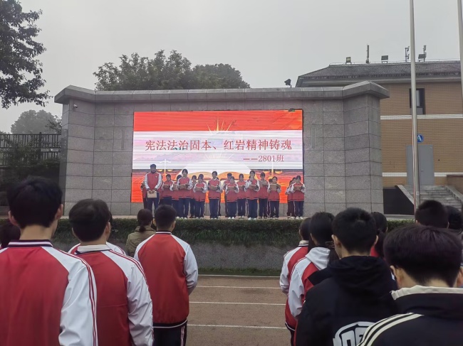 12月1日,在全校升旗仪式上,校长黄超骏作了《悟宪法内涵 担法治之责》主题讲话;2801班级进行了法治教育主题为《宪法法治固本 红岩精神铸魂》的班级风采展示。